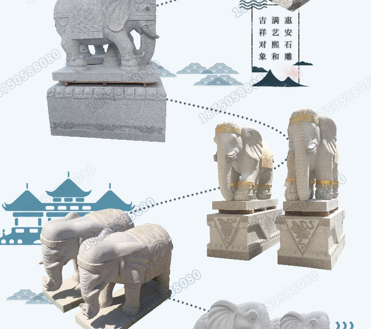 采用福建芝麻白花岗岩石材加工制作的六牙石雕大象,很明显的特征之一就是后背上背着一个风水球,风水球的下方是一个莲花台。整只石雕大象全身由璎珞环绕,腹部两侧打浮雕青天白日图样,是一对适合宗教寺院或是山门前面摆放的石雕大象,镇宅吉祥。